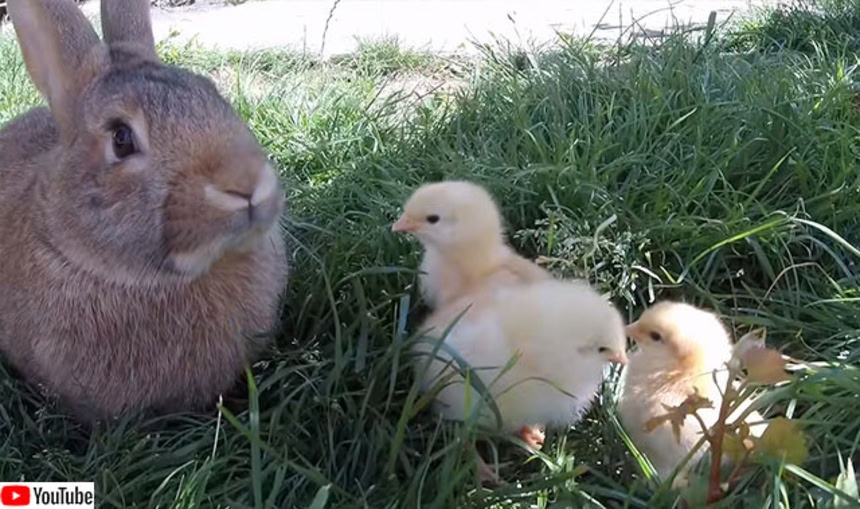 続きを読むうさぎと3羽のヒヨコが寄り添って木陰でくつろいでいる。遠くにいた猫がこちら側にやってきて、仲間の猫と合流…