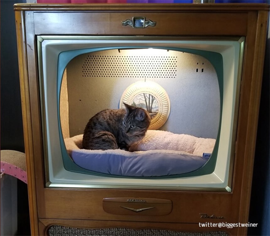続きを読む猫に全力で愛情を注ぐお父さんは、古いテレビをDIYし猫用のベッドを作り上げた。ブラウン管を取り外し、まるで猫がテレビに映っているかのようにも見える会心の作品だ。3匹いるうちの1匹はとても満足して使っているようだ