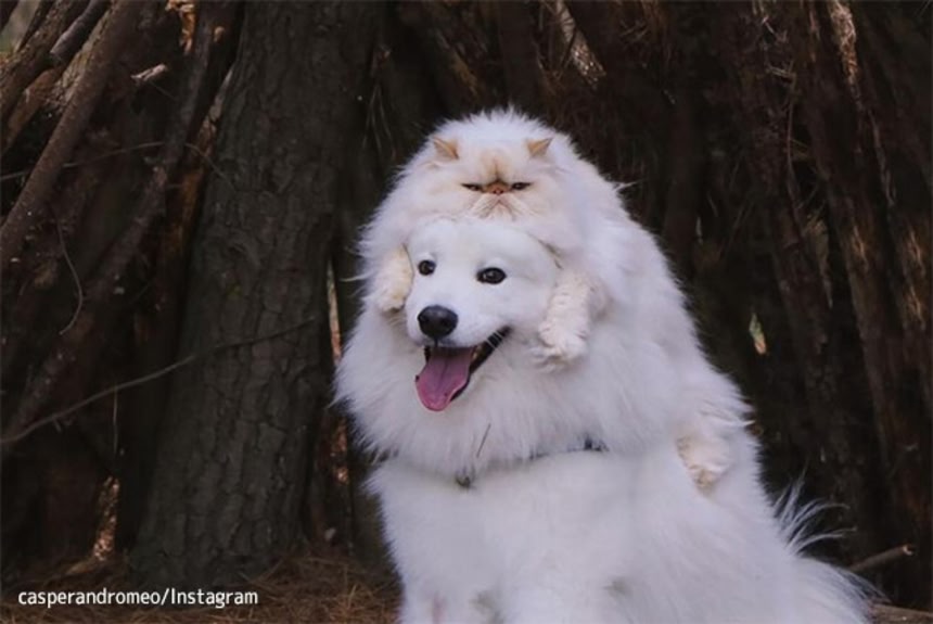 続きを読む幸せそうな満面の微笑を見せる白いサモエド犬と、その上に乗っかって不機嫌そうな表情をしている…