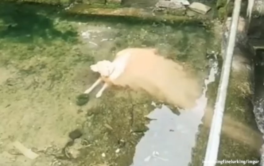 続きを読む水の中に入ってくつろいでいたベージュ色の犬なのだが、その体から同じベージュ色の液体が流れだしているように見える…
