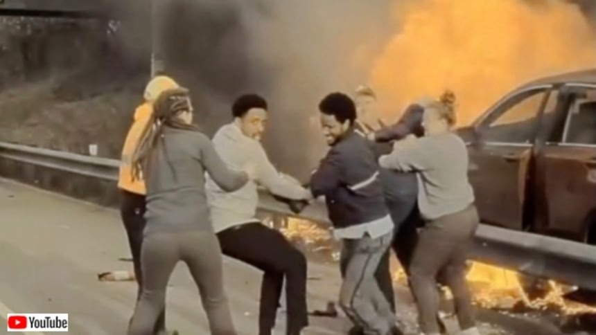 一致団結して燃え盛る炎の中から男性を救出する通りすがりのドライバーたち