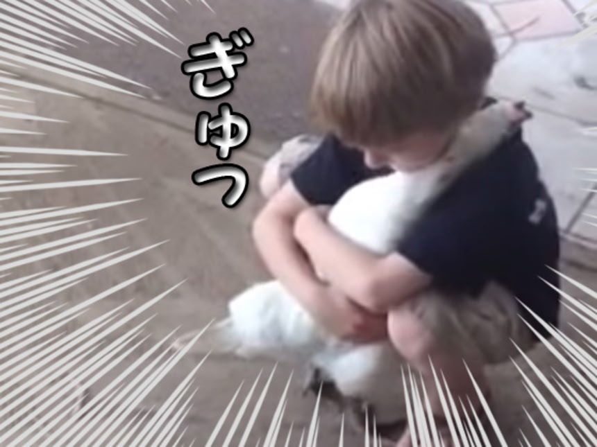 続きを読む男の子のそばにかけよってきた一羽のニワトリ。男の子が手を広げるとすっと胸の中に。そして男の子はギュっと抱きしめる…