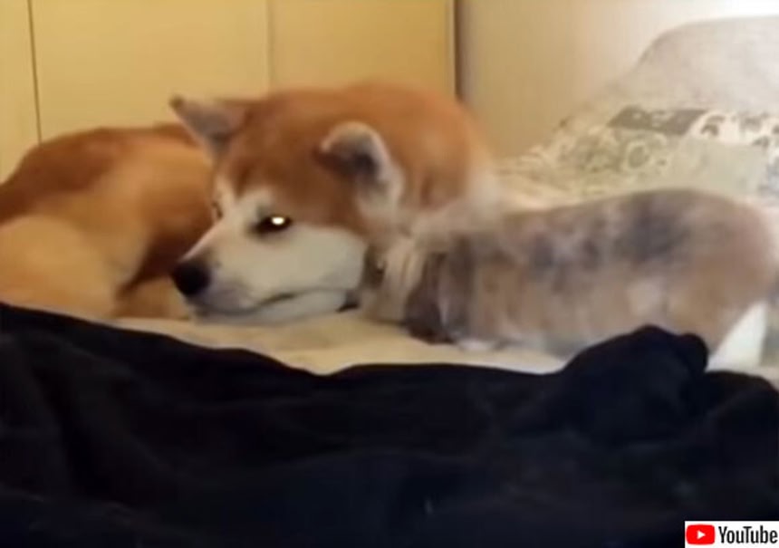 続きを読む秋田犬とウサギを飼っているお宅の日常のひとこま動画。ベッドの上で休んでいる秋田犬にウサギがピョンと飛んできた…