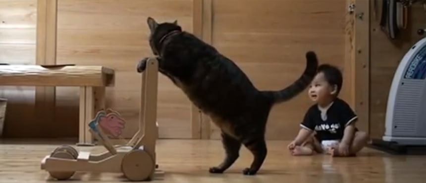 カタカタカタ、「じゃあやってみな。」赤子に押し車の使い方を教える猫先生
